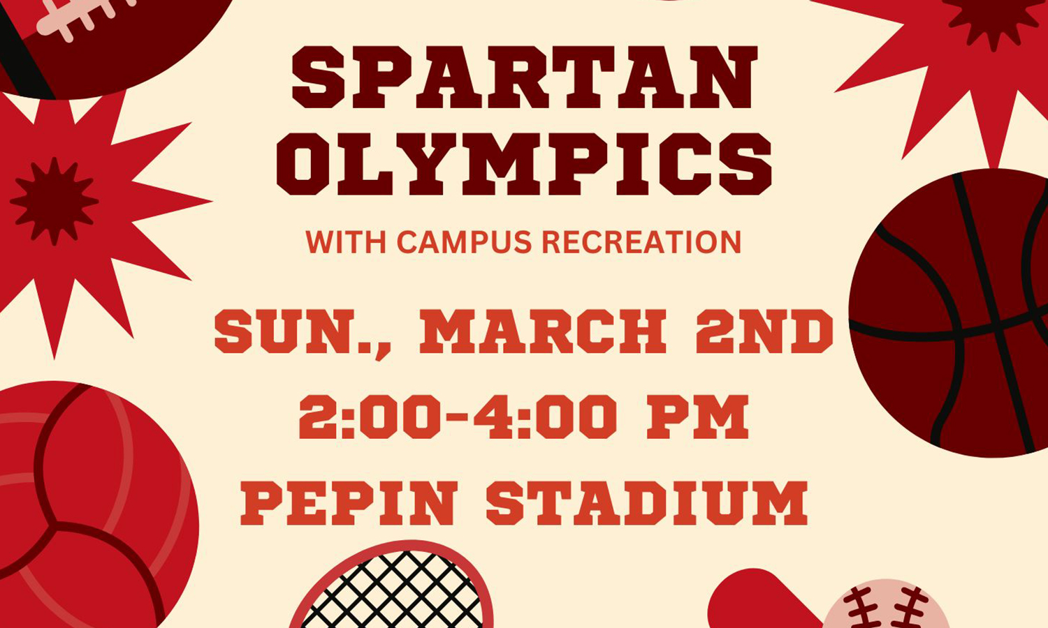 TAMPA, Fla. — Student Productions is hosting a Spartan Olympics on Sunday, March 2, from 2-4 p.m. in Pepin Stadium.